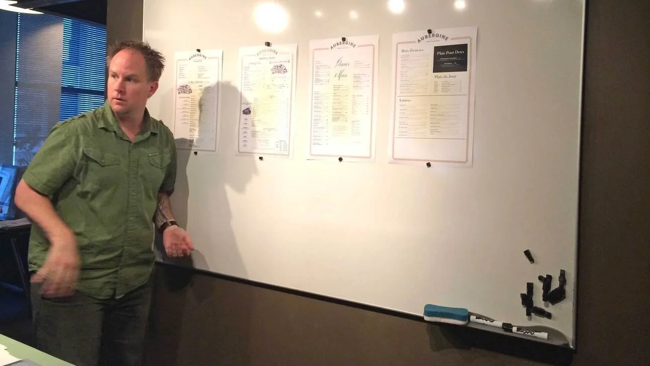 Creative Director Michael Stinson reviewing design directions at the crit wall at our Ramp Creative office in downtown LA